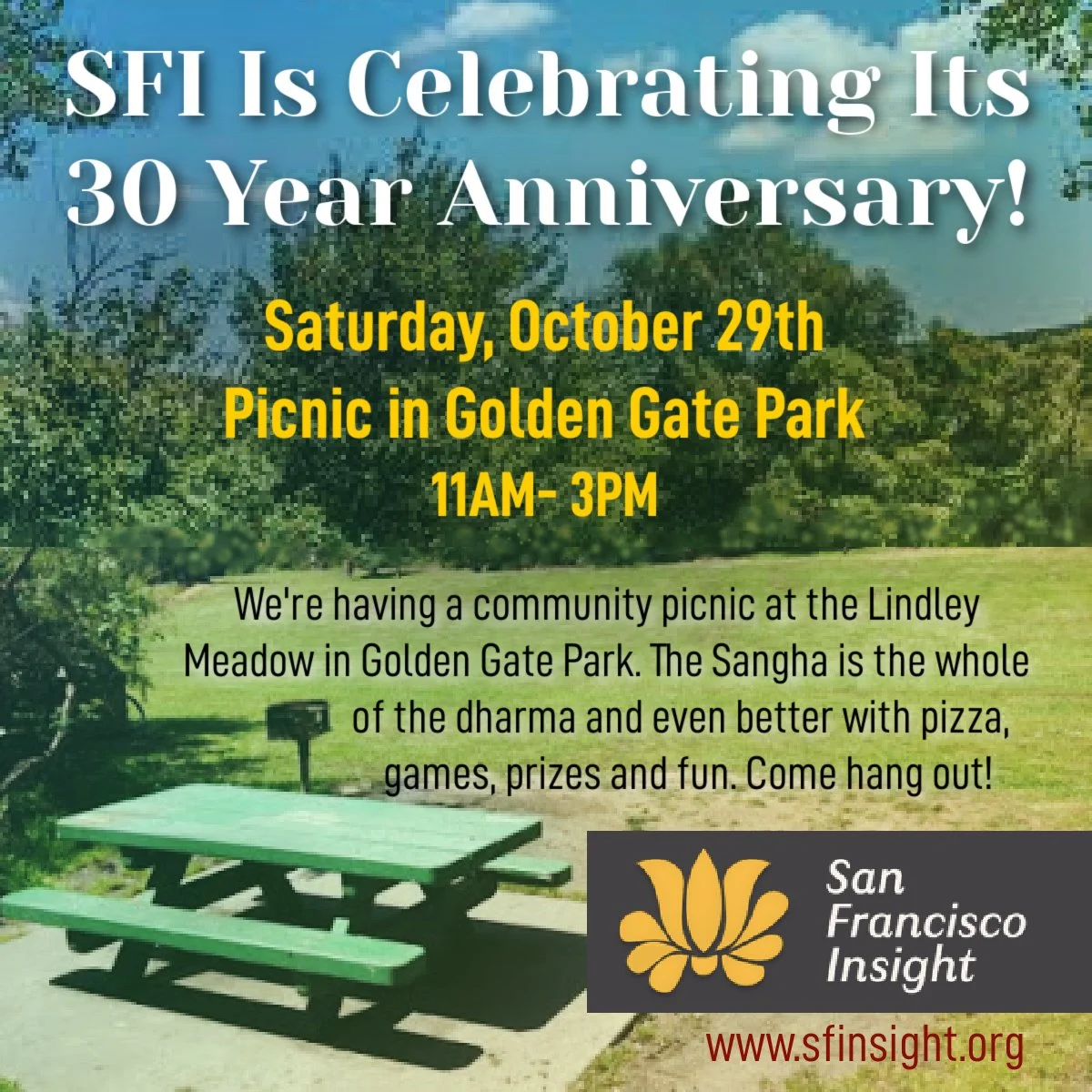 We’re having a community picnic at the Lindley Meadow in Golden Gate Park! The Sangha is the whole of the dharma and even better with pizza, games, prizes and fun. Come hang out for an easeful day with community, SFI teachers and Board and enjoy a great day outdoors. Just bring yourself! A side salad or a treat to share is optional.
