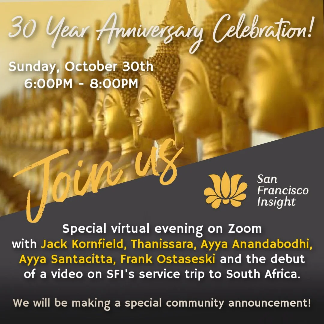 Join us for a special virtual evening on Zoom with guest teachers and speakers including Jack Kornfield, Thanissara, Ayya Anandabodhi, Ayya Santacitta and Frank Ostaseski, as we honor our evolution, discovery and awakening in this life. Take in the debut of a beautiful video on SFI’s service trip to South Africa. We will be making a special community announcement! Your unique presence is requested for this occasion.
